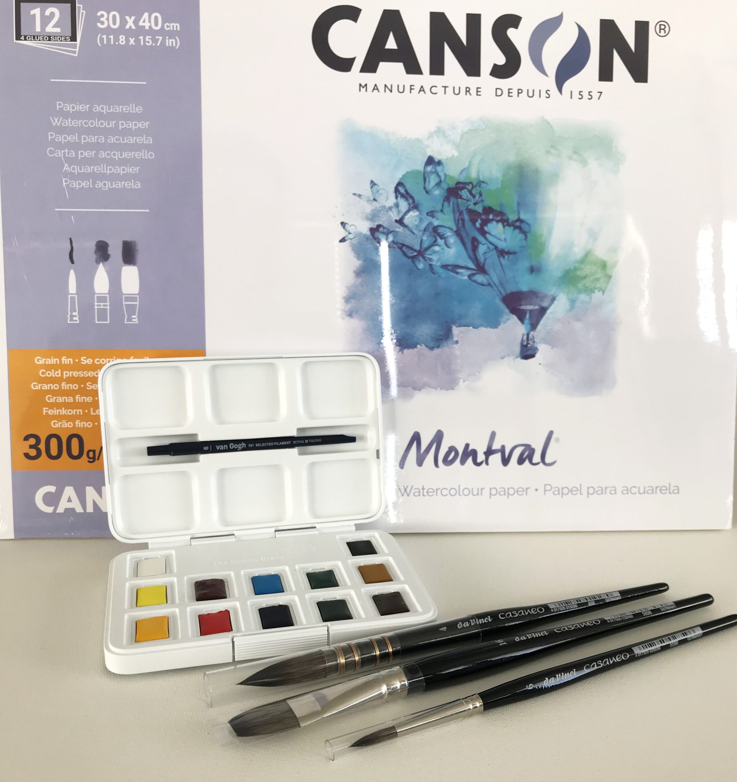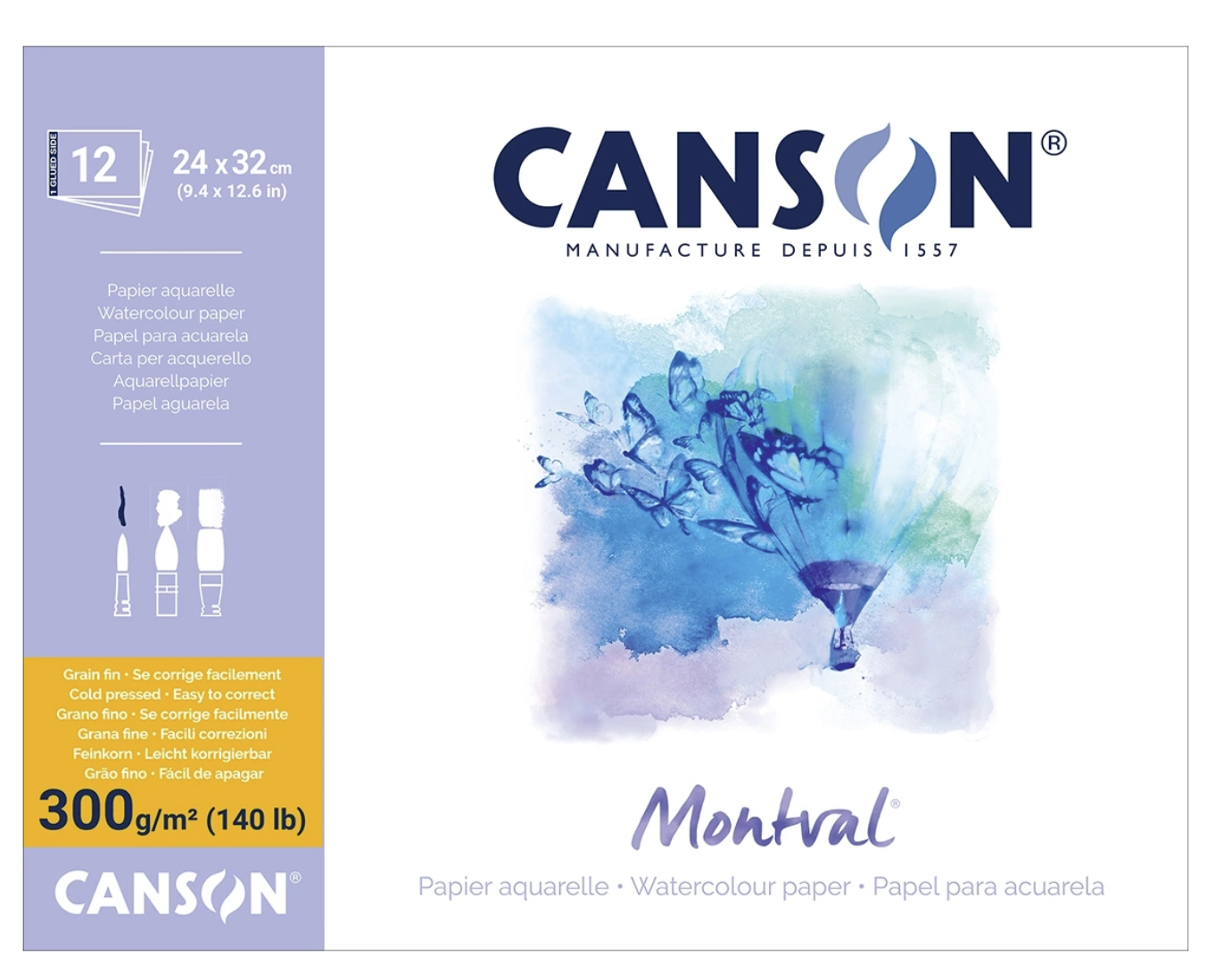 1. Canson Montval akvarelpapir, str. 30×40 cm, med 12 ark.