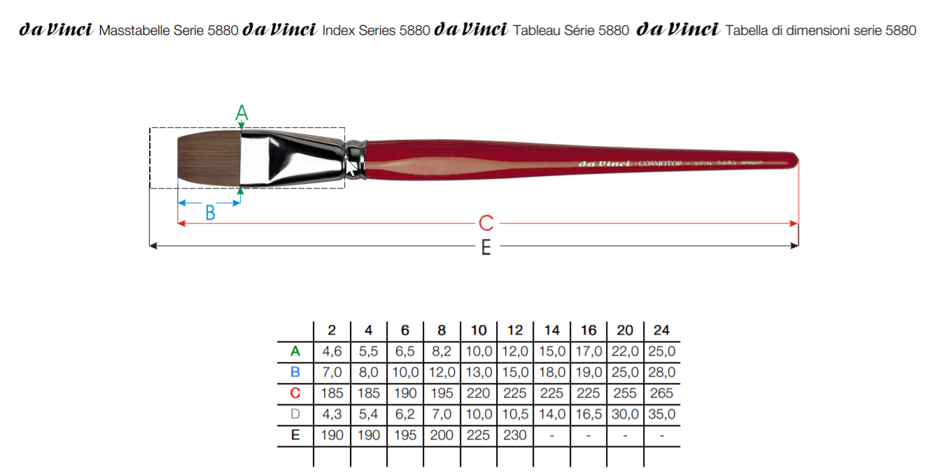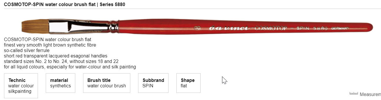Cosmotop Spin er en akvarelpensel fra da vinci med syntetiske hår. Denne pensel har en flad form. En god holdbar og slidstærk pensel, som er karakteriseret ved at have: