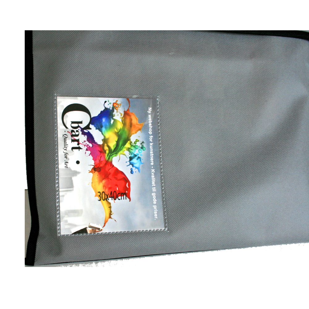 På forsiden er en lomme med en lynlås til opbevaring af fakturaer, visitkort mv. Der er en lille gennemsigtig lomme på forsiden, hvor størrelse på Art Bag’en står, og hvor du kan lægge information, så du hurtigt kan identificere hvilket maleri der er i tasken.