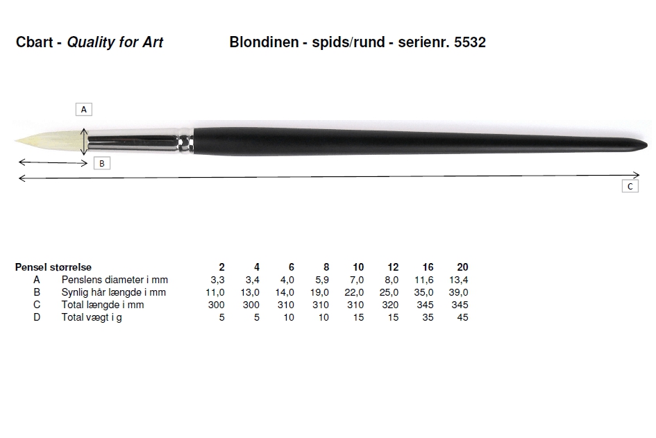 Generelt kan sige om Cbarts pensel, BLONDINEN, at det er en kunstnerpensel i rigtig god kvalitet. Penslen har blonde lange syntetiske hår, som er hule og derfor kan holde meget maling. Penslen er velegnet til både olie og akryl, har forholdsvis lange hår og en virkelig god elasticitet. En slidstærk pensel, som holder formen godt. BLONDINEN har langt matsort lakeret skaft. Cbarts pensler er produceret i Europa og overholder de strengeste krav til miljø og arbejdsmiljø. Desuden anvendes kun FSC® certificeret træ, samt maling/fernis der overholder samme krav som er gældende for legetøj. Se penslens specifikationer under fotos.