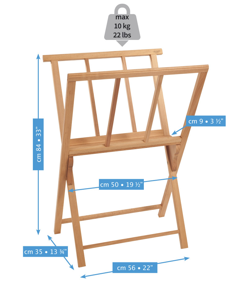 En foldbar grafkholder/ -stativ ( Folding Print Rack) fra Mabef. Super kvalitet i olieret bøgetræ og let at have med på udstillinger til display af malerier, tegninger, prints mv.