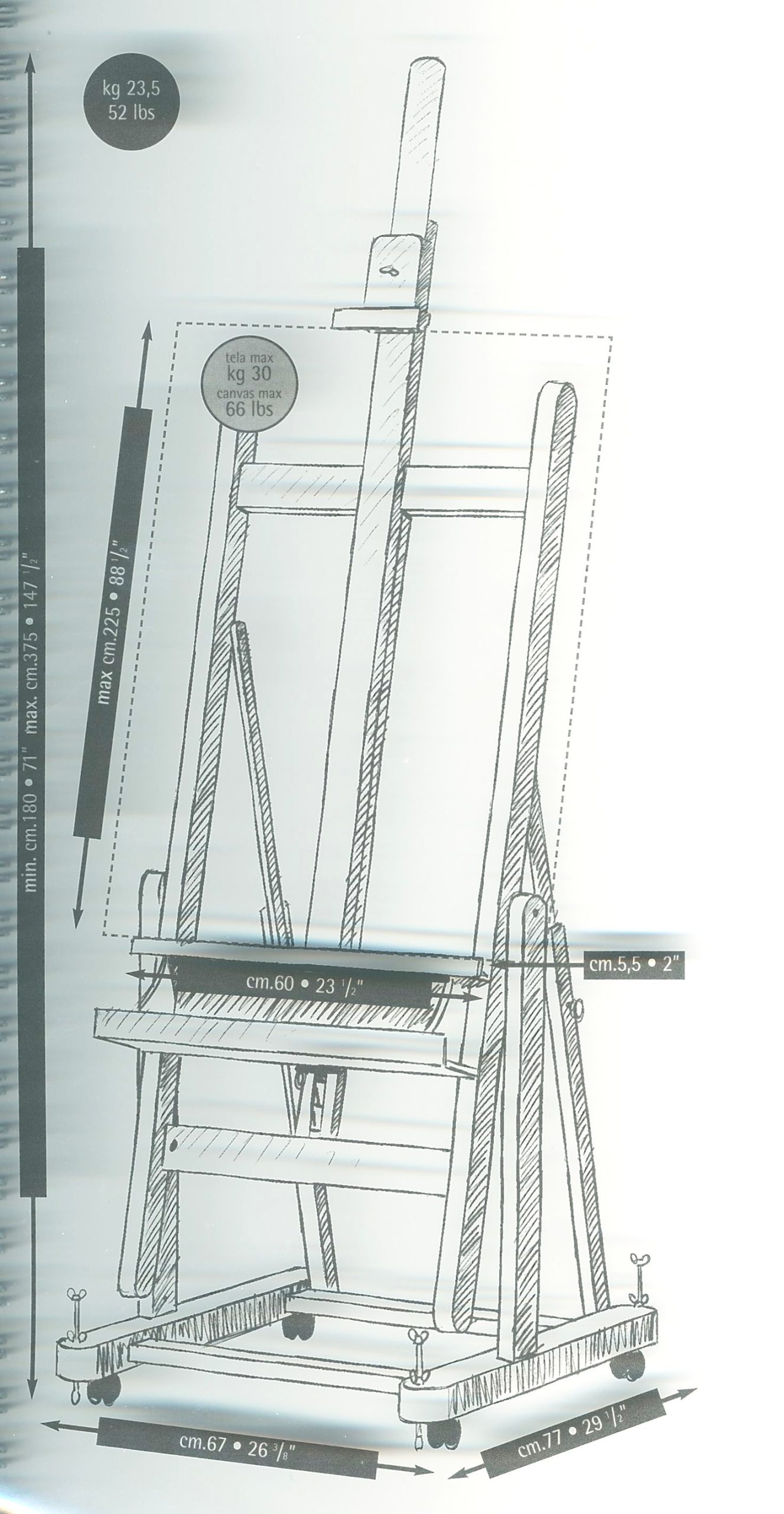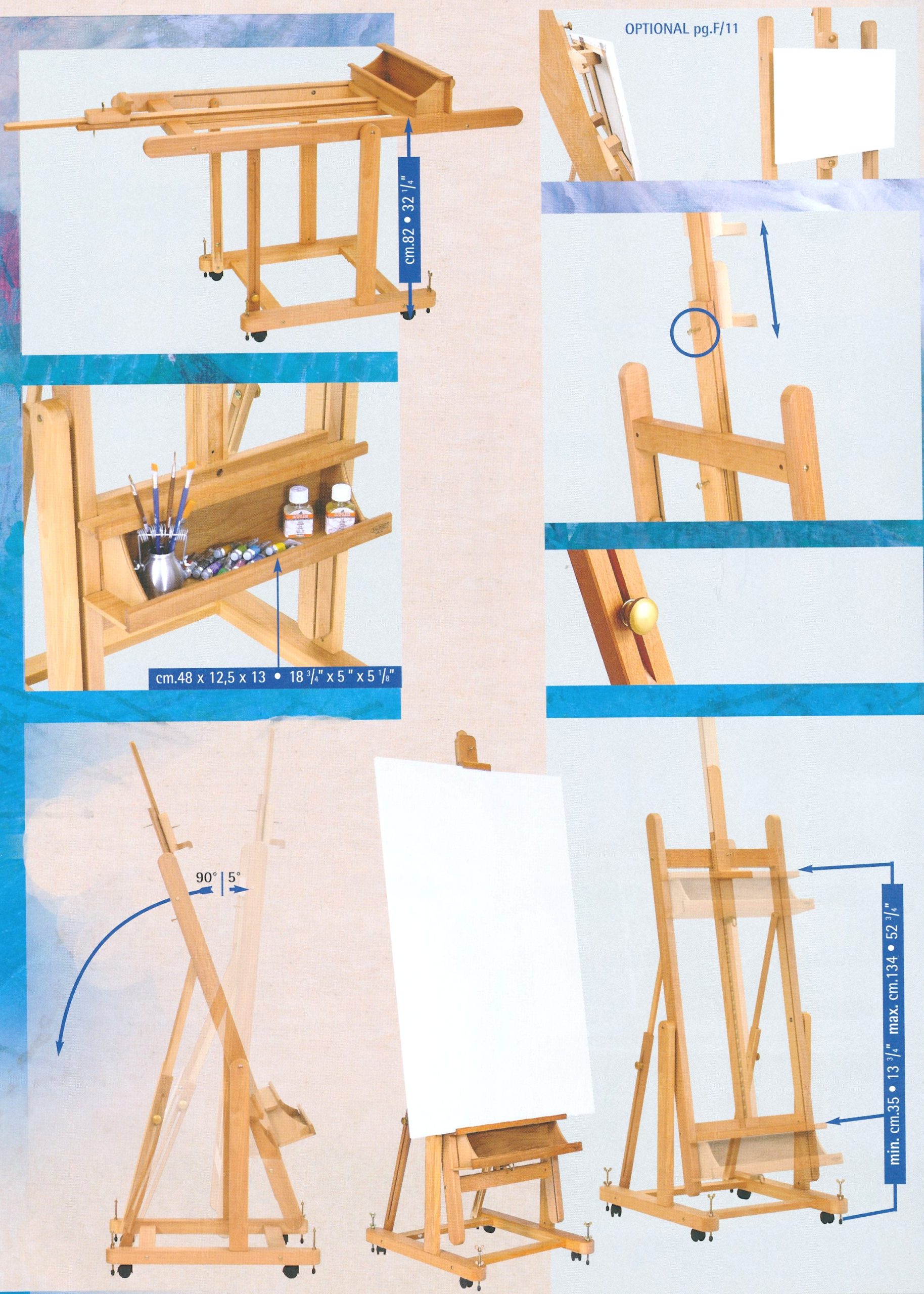 Mabef M18, er et staffeli i olieret bøgetræ, som kan vinkles fra -90 til +5 grader.