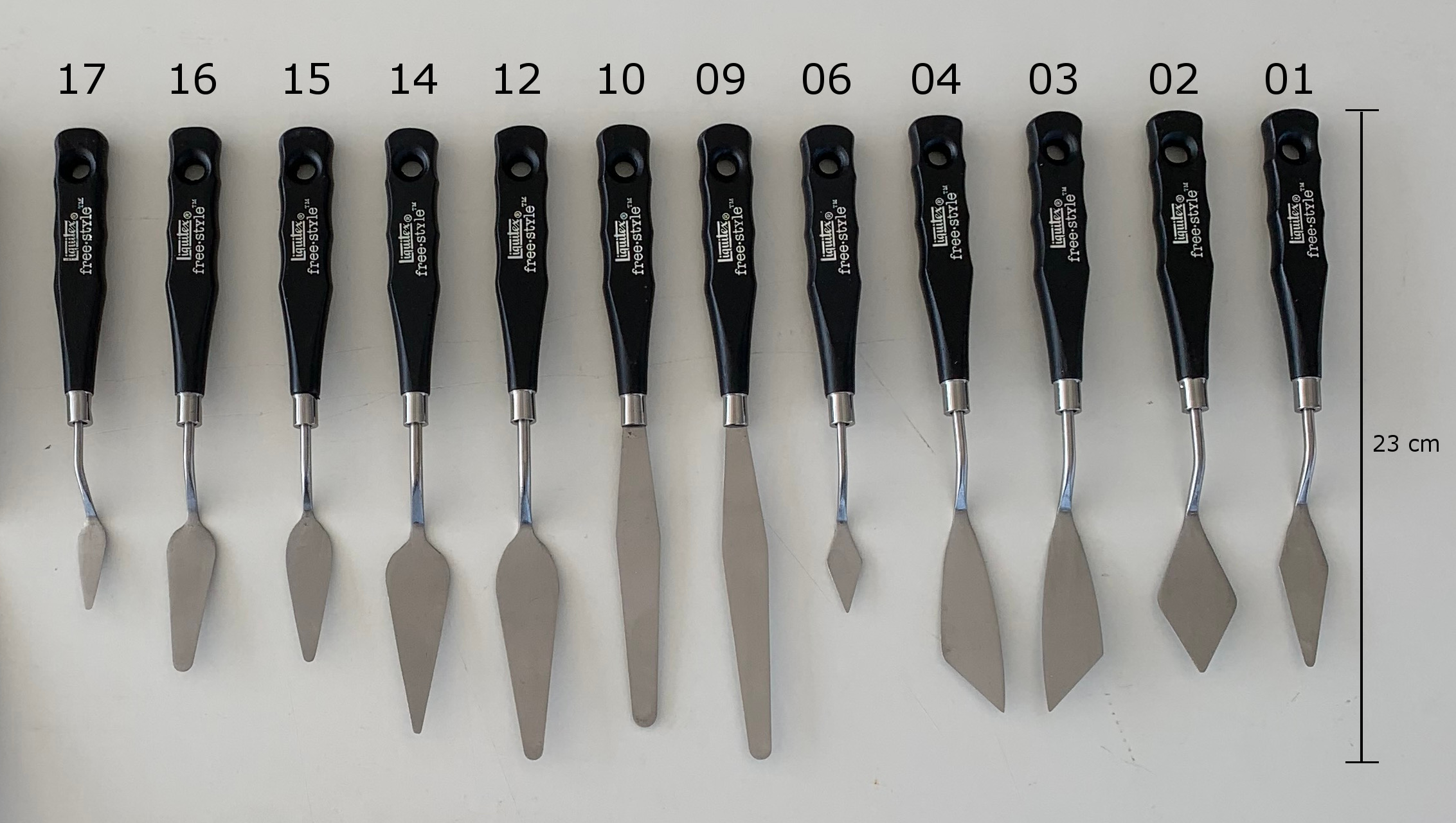 Her finder du maleknive, metalspartler fra Liquitex. De findes i forskellige størrelser og former.