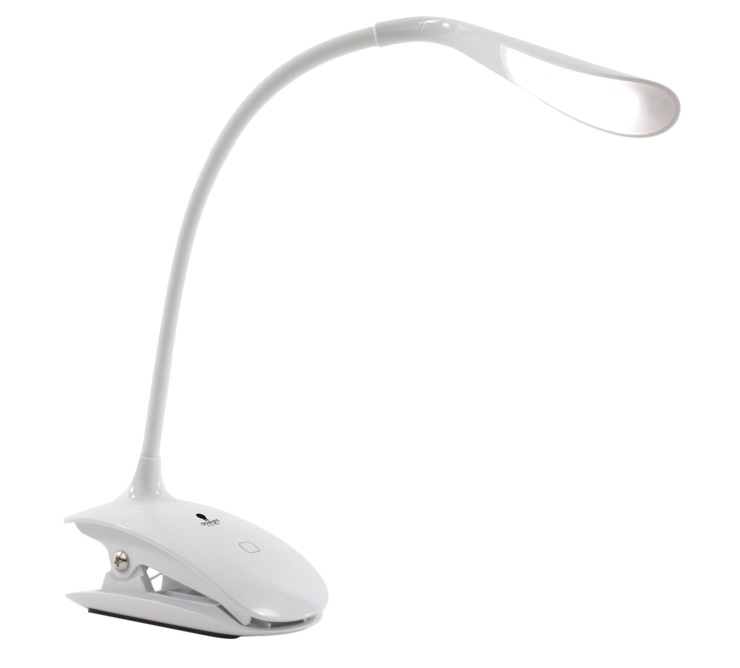 • Lille elegant lampe i hvid, der påsættes bordplade, bog, tegneblok eller hvor som helst