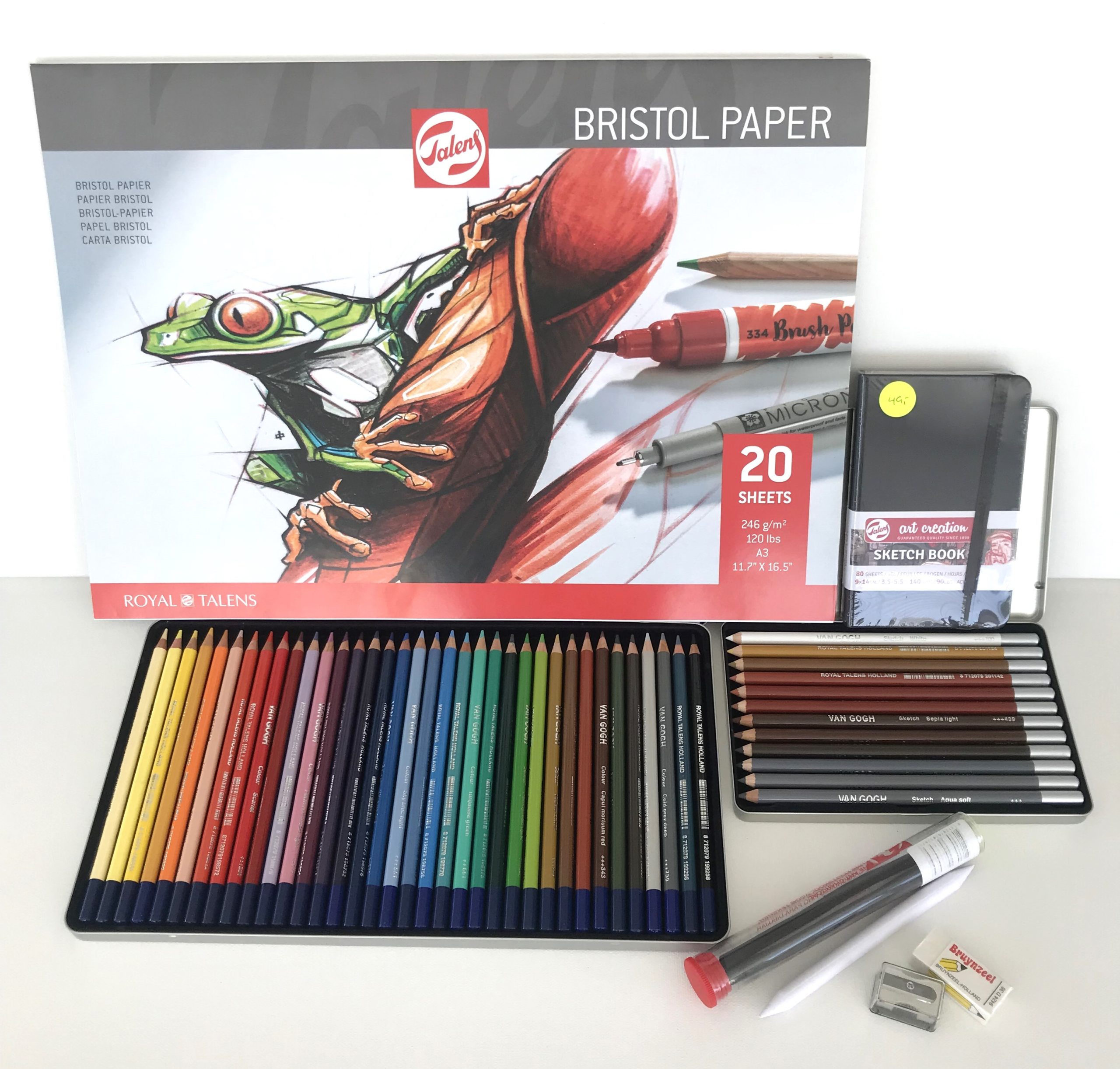 Dette startsæt til tegning, indeholder alt hvad du skal bruge for at komme godt i gang med at tegne. Sættet indeholder superfine farveblyanter, grafitblyanter og kul. En skitsebog, lige til at tage med dig rundt, en blok med rigtig godt Bristol-tegnepapir i A3. En blyantspidser, viskelæder, og så en papirstub, så du kan udglatte detaljer.