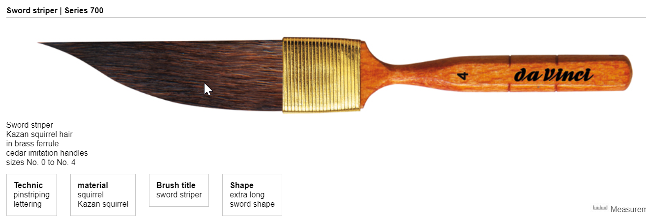 Sword Striper fra da vinci er en ægte egernhårspensel. Denne pensel i rene egernhår har form som et sværd, deraf navnet. Penslen er særdeles velegnet til at trække ekstremt lange og lige linjer i frihånd.